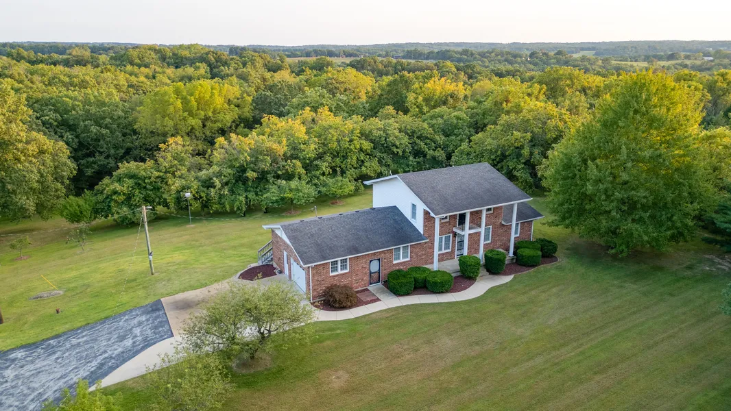 For Sale in Southern Missouri - Colonial Style 2-story home in the Ozarks town of Mountain Grove. This beautiful brick home sits on 16 park-like acres with mature trees, a stocked pond, and a 30'x40' shop building.