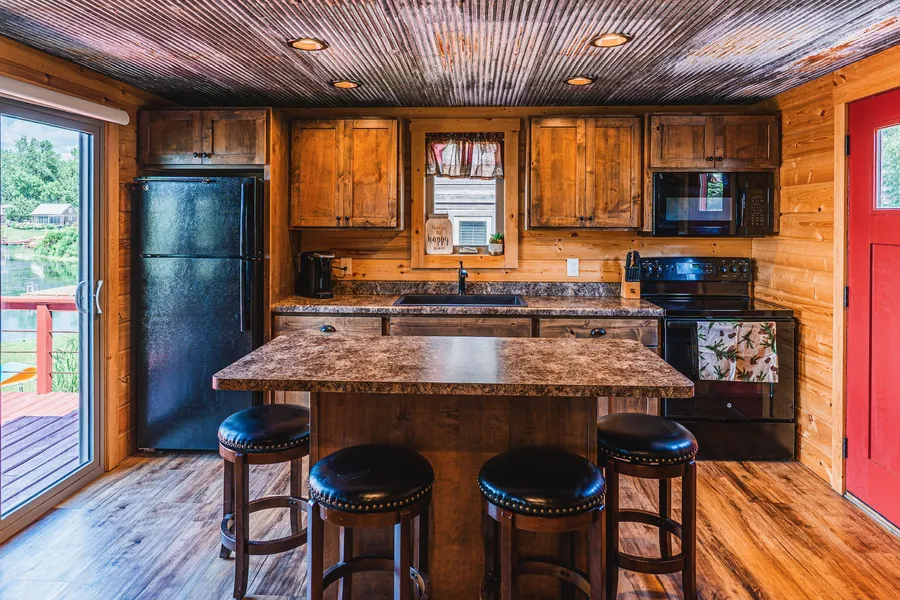 The cabin is turnkey fully furnished with 4 beds, couch, recliner, end tables, 3 TVs, four dressers of varying sizes, bar stools for kitchen island.
