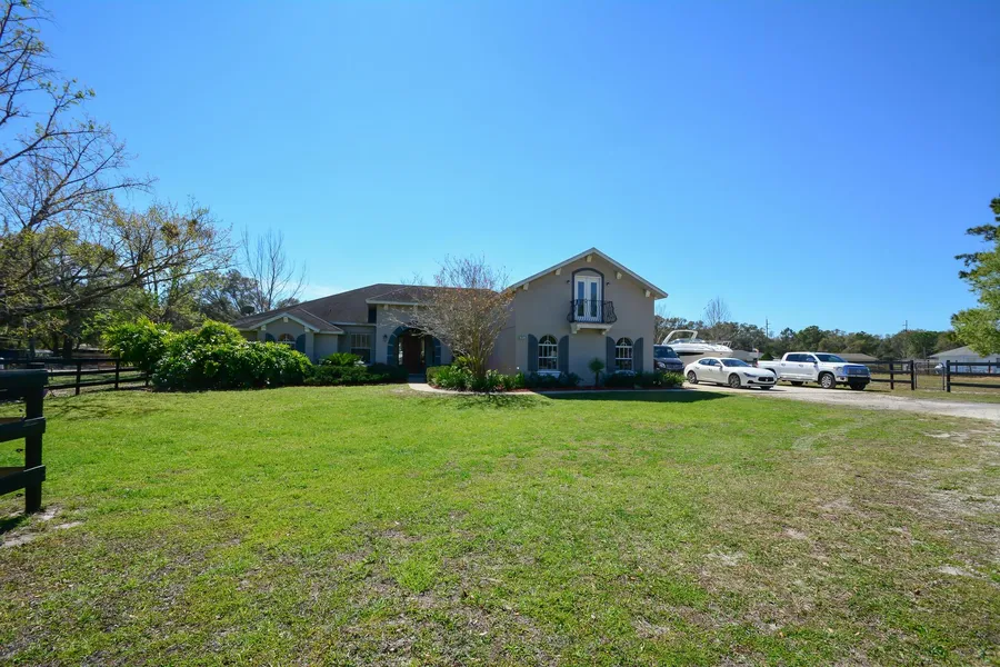 A MUST SEE EQUESTRIAN RANCH SET UP W/ A CUSTOM MEDITERRANEAN POOL STYLE POOL HOME W/ APPROX. 2400 SF DETACH 2 STORY BARN ON FIVE ACRES FENCED & CIRCULAR DRIVE. SOME OF THE FEATURES TO THIS SPECIAL PROPERTY INCLUDE A 1200 SF CEMENT FIRST FLOOR BARN AREA SET UP W/ ELECTRIC & WATER THAT LEADS OUT TO A 4 PADDOCK AREAS & PASTURE. THE BARN IS SET UP W/ A NEW PERMITTED SEPTIC FOR THE APPROX 1200 SF TOP FLOOR BARN AREA UNDER AIR W/ A FULL BATH & A HALF BATH, KITCHEN, LAUNDRY AREA & OTHER ROOMS. THIS AREA COULD BE USED TO HOUSE FAMILY & FRIENDS WHEN VISITING. THE MAIN HOUSE IS 3,444 SF UNDER AIR, 4,458 UNDER ROOF W/ 4 BEDROOMS, OFFICE W/ DOUBLE FRENCH DOORS, WIDE PLANK HICKORY FLOORING THROUGHOUT, 27X15 BONUS RM SET UP AS A BEDROOM W/ ORNATE JULIET BALCONY & DOUBLE FRENCH DOORS. OTHER FEATURES INCLUDE A 28X14 MASTER BEDROOM, DOUBLE FRENCH DOORS TO POOL AREA, SITTING AREA & MASTER BATH AREA W/ TRAY CEILING, CUSTOM SINK GLASS BOWLS, JETTED GARDEN TUB, VANITY, SEPARATE SHOWER, GRANITE COUNTER TOPS & TWO WALK IN CLOSETS. THE 17X13 GOURMET KITCHEN FEATURES 42" CABINETS W/ SELF CLOSING DRAWS, CARRABBA GLASS AND QUARTZ COUNTERTOPS, DOUBLE CONVENTION OVENS, ITALIAN DUAL BERTAZZONI COMMERCIAL RANGE HOOD, WALK IN PANTRY W/ LIGHT & A 10 FT COUNTER TOP THAT OPENS UP INTO THE 22X16 FAMILY RM W/ GAS FIREPLACE, DOUBLE FRENCH DOORS FOR VIEW OF POOL AREA. THERE IS A DINETTE AREA W/ SEAMLESS GLASS WINDOW AREA, TASTEFULLY DECORATED 18X15 FORMAL LIVING RM & LARGE DINING AREA W/ CUSTOM CHANDELIER. SO SPECIAL, UNIQUE & AWESOME!!!