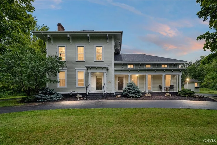 Welcome to a grand Italianate Architecture Old Style home built in 1860, featuring classic architectural details such as crown and cove moldings, French and pocket doors, and wide plank pine and hardwood floors. The home offers a front porch, a two-story foyer, a sitting room with pocket doors to a family room on the left side, while the right side includes a dining room and a separate library or office with bookcases. Behind the main living spaces is a large country kitchen. The second floor is accessed by a back staircase and includes four bedrooms, a den, two bathrooms, and a full attic. The property also boasts a beautifully appointed multi purpose room and a mudroom addition that opens to a patio overlooking 2.7 acres of privacy. Additional features include a three-car garage. First floor laundry. Generator. New Roof, outside is freshly painted. The property is versatile, allowing for use as a single-family home, home office, or for small-scale farming. The road noise is not an issue when in home. To lessen the road noise outside the home, you can put trees along the frontage. Don't miss this charming home that is ready to move right in and love your life!