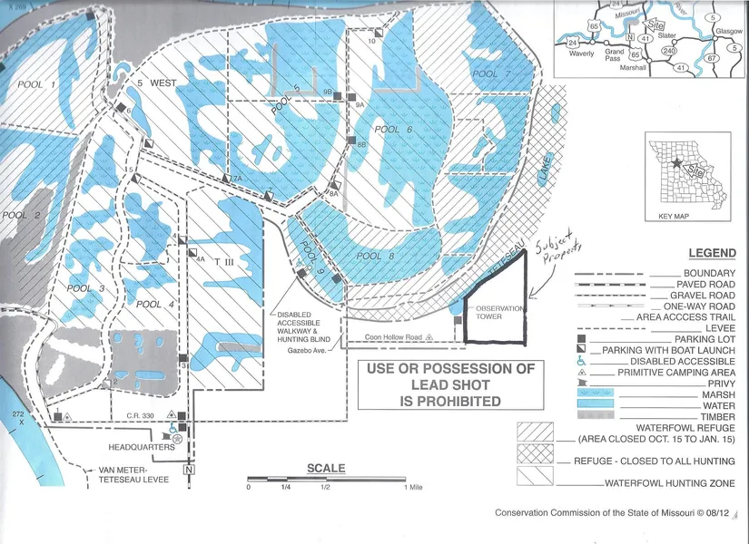 The tract contains 85 acres of wetland with a 30 to 40 acre water cell, an electric water pump that pumps 6000 gpm. This tract is located next to Teteseau Lake and the waterfowl refuge on the southeast side of the area. Location of this property makes for great hunting as there is less hunting pressure on the ducks on the refuge.