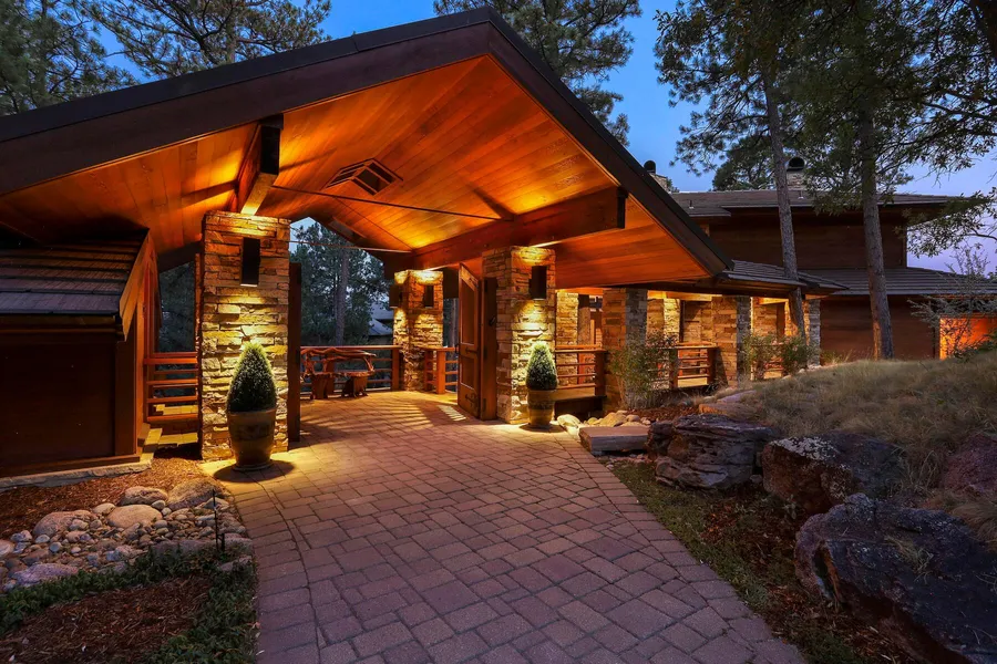 Make an undeniable statement in this remarkable C. Steven Goerges designed modern masterpiece that seamlessly blends indoor and outdoor living. Located on the 17th green of the private and prestigious Castle Pines Golf Club, this 3 bed | 4 bath home combines the elements of of stone, glass, copper and slate to create an absolute entertainer's dream. As rare and refined as the architecture of this home is, its location within the coveted, gated community of The Village at Castle Pines on a secluded lot, surrounded by soaring pine trees, serves to amplify its appeal. The main floor features a large kitchen and breakfast nook, living room, show-stopping dining room framed by floor to ceiling stone pillars and surrounded on three sides by glass, family room with wet bar, powder room and office. A large deck and multiple outdoor flagstone patio spaces may be accessed from the main level. The upper level features an entire owner's suite complete with large bedroom, huge bathroom with his and hers vanities and full 4-sided stack stone shower, sitting area, private deck, and huge closet. The lower walkout level includes a recreation area, two additional bedrooms and bathrooms, large laundry room, wine room and solarium that may be used as a workout room or stunning guest suite, as well as additional outdoor spaces. Visually stunning, the vertical stone pillars, impressive up to 7-foot wide custom built eaves and roofline, one-of-a-kind entryway and an abundance of natural light will offer one fortunate buyer the chance to inhabit a perfectly balanced work of architectural art. Built to enhance views of both the golf course and natural surroundings, this stunningly serene home is equally as dramatic as it is airy. Maximizing light and space, this retreat is singularly unique and offers the qualities of an incredible oasis. A rarest of rare homes, this once in a lifetime retreat is not to be missed. Showings start on Friday, September 17.