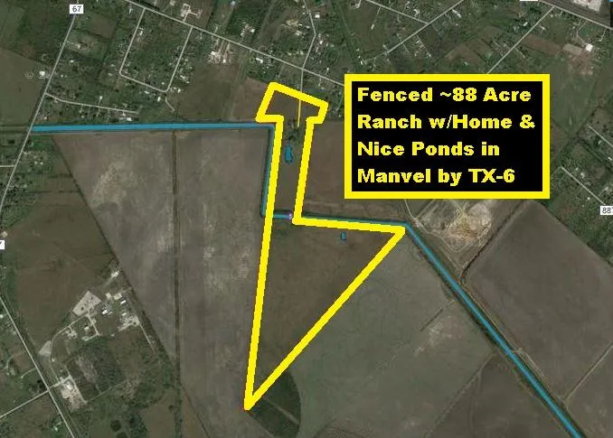 New Price! Owner Financing Available! Manvel ~88-Acre Fenced Ranch w/Home & 2 Ponds by TX-6 near TX-288, Manvel Schools & Fire/Police Depts. 30x75 & 24x70 Metal Buildings. 20x36 Hay Barn. Run-In & Working Pens For Cattle. Private Bridge over Canal to Access Other Tracts. Minutes to TX-288 & TX-35 provides easy commute to TX Medical Center, Houston, Pearland Town Center & Lake Jackson. Ag Exempt for Hay! No Restrictions, Buyer Needs to Verify! 10 miles to Pearland Town Center & BW-8. 25 miles to Texas Medical Center, Downtown Houston, Hobby Airport & Nasa/Johnson Space Center. 30 miles to Kemah. 40 miles to Galveston. Manvel City Limits! Call Capital Farm Credit for Loan*