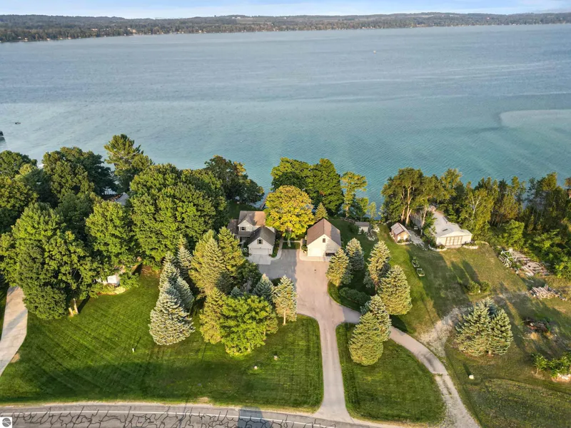 338 Feet of Elk Lake Frontage - Rare, Splittable Property. Properties like this are nearly impossible to find on Elk Lake. This estate offers one of the largest stretches of shoreline available on the lake today, and it has the potential to be split, creating multiple prime parcels on one of Northern Michigan's most desirable lakes. Set just minutes from Elk Rapids, the 4-bedroom, 4-bath home offers a fantastic foundation with room to expand. Features include an attached garage, an unfinished basement, and an unfinished bonus area above the detached garage, ideal for a guest suite or studio. Multiple outbuildings provide space for storage, hobbies, or lake toys. The property's expansive yard and established gardens are the perfect complement to the breathtaking sunrise views over Elk Lake.