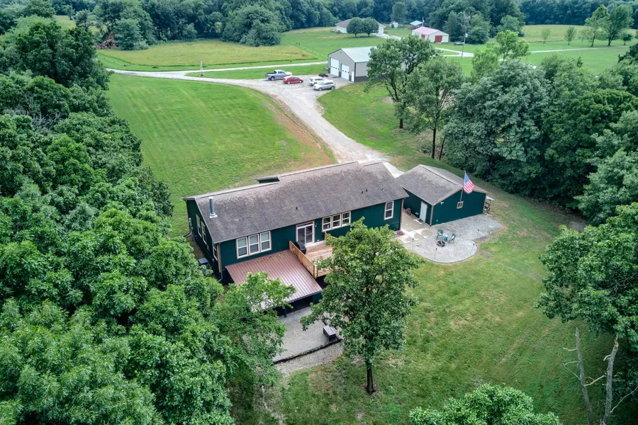 Immaculate 3 bed/2 bath ranch home on 5 acres with an abundance of birds and wildlife. Nestled in the woods, peaceful and quiet with a long private drive. Beautiful rock landscaping, perennial flowers, low maintenance so you can play hard, not work hard. Lower covered patio to enjoy those summer evenings. Room to roam in the great outdoors while you go for a UTV trail ride through the woods. The new 40 x 60 outbuilding has a separate electrical panel/meter, 30 amp camper plug, plenty of LED lights and outlets, and 2 commercial Raynor doors (14 x 12 and 10 x 12). Detached garage has 2 automatic doors and would make a great workshop, or additional parking and storage. The gorgeous kitchen has fingerprint resistant black stainless steel appliances, a large pantry, and a "Chic" center island. Watch the birds and enjoy a cup of coffee off the new back deck. Open floor plan with a formal dining room, living room with wood burning fireplace with extra room to entertain. Master Bedroom Suite includes a private jacuzzi tub, walk-in tiled shower, double vanity, and walk-in closet. Nice size laundry room, washer and dryer stays. This home is move-in ready, new carpet, fresh interior paint, and room to grow in the full unfinished walkout basement with 9' ceilings. 6 Miles to I-35 and 35 minutes to Liberty. Easy commute and minutes from town. If you're looking for an acreage and a well cared for home, this is it!