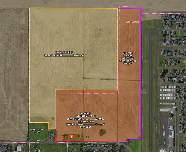 City of Independence "Enterprise Zone" development property. 43 acres Zoned IP - (Industrial Park), 41 acres zoned Airpark Development as well as 110 ac Exclusive Farm Use EFU farm ground. The City has expressed interest in considering various strategies to support various types of development. Plenty of power at the property. Utilities require off-site improvements. The 41 acres Airpark Development (AD) ground has potential to change to Airpark Residential. (Current zoning is EFU, AD, IP)