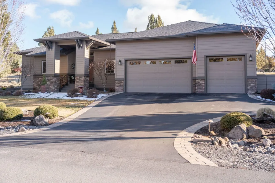 Welcome to this stunning custom home on the 5th hole of The Ridge golf course in Eagle Crest. This one-owner, single-level home sits on nearly half an acre, blending comfort and elegance. Inside, 10-foot ceilings and a stacked stone gas fireplace create an inviting atmosphere. The kitchen features a new oven and dishwasher, ample pantry space, and an open flow for entertaining. The primary suite offers a heated bathroom floor and a large walk-in shower. With two additional bedrooms, an office/den, and an oversized three-car garage, this home provides flexibility for family or guests. Enjoy peaceful golf course views from the patio. Don't miss this rare opportunity to own a piece of Eagle Crest paradise!
