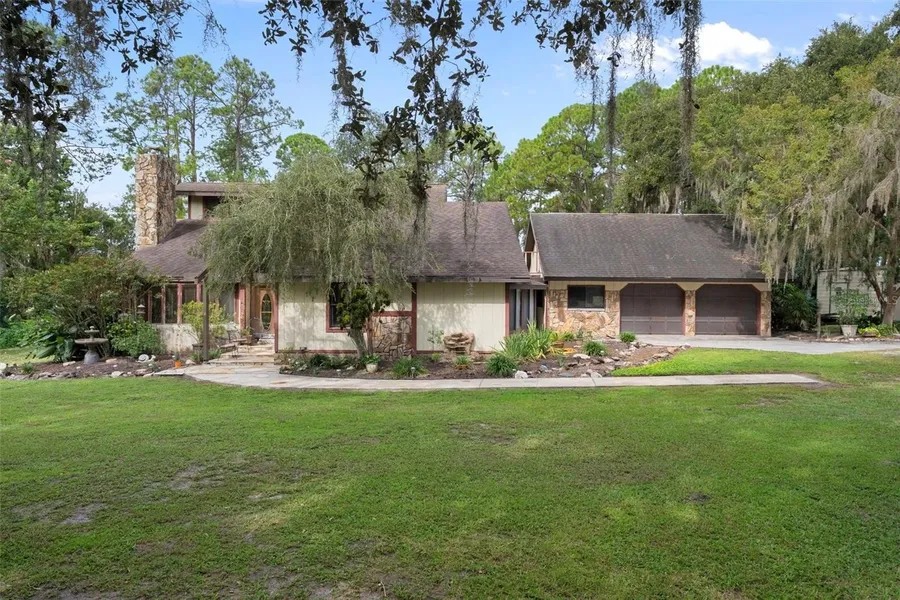 Under contract-accepting backup offers. LOCATION, LOCATION, LOCATION! This property is offering both privacy and city convenience! This exceptional property has it all, it is charming and very unique but is in need of some TLC. No HOA, No Deed Restrictions, No CDD. This 3-bedroom 2-bath home sits on 2.2 acres of beautiful grounds with amazing wildlife. Welcome to country charm at its best! Features include large barn, large chicken coop, covered animal stall, enclosed tack room and a covered gardening/potting shed area. Plenty of space for all your toys and animals. Extra-large garage and workshop and an additional large storage building. The outdoor area is a true oasis. Inside there is an airy spacious feel to the home. Walking through the front door opens up to a lovely Livingroom with a beautiful stone wood burning fireplace, a dining room with French doors that opens out onto a large glass enclosed patio. There are two bedrooms and guest bathroom downstairs and laundry closet. Kitchen features a large walk-in pantry and a dining area with French doors that walk out onto the large glass enclosed patio. The upstairs area is truly amazing!! Walk up the stairs to find a quaint sitting loft area which opens onto a balcony, sit and enjoy your morning coffee while enjoying the beautiful scenery of your backyard and a view of the Lake in the distance, or enjoy a cocktail in the evening while you watch the beautiful sunsets. The primary bedroom offers a private office space/bonus room and an addition large side bedroom with a sliding glass door that opens onto a private deck area that takes you over to an additional private bedroom / bonus room (perfect man cave), there is also a staircase that takes you downstairs to the breezeway area between the home and garage. There you can enter into the dining room and kitchen, enter through the door into the enclosed patio or enter into the garage & workshop. This property is ideal for those seeking extra room both inside and out. This home is conveniently located just minutes from all the amenities of Wesley Chapel. Exceptional hospitals, tons of shopping, you have The Grove and KRATES at the Grove, B&B16 Theaters, The Shops at Wiregrass and the Tampa Premium Outlet Mall. Located less than 3 miles to the popular Epperson Lagoon the first crystalline lagoon in the U. S it is a 7.5-acre resort-style community, where you can purchase an All-Day Ticket & Splash Pass to enjoy the water park w/ water activities, including kayaking and obstacle course. Conveniently located to I-75 and I-275 to access Tampa, Clearwater/ St. Petersburg and Orlando. Schedule your private showing today.