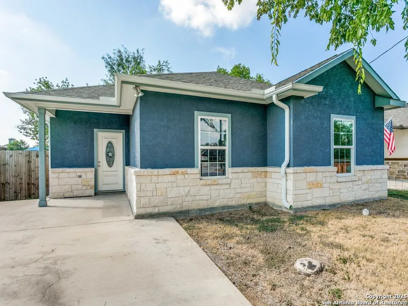 Welcome to this thoughtfully designed 3-bedroom, 2-bathroom single-family residence, spanning 1,407 square feet in the Harlandale area. This home features an open layout that effortlessly blends the kitchen, dining, and living spaces, ideal for daily routines and gatherings. Inside, you'll find resilient wood-look tile flooring across the entire home for straightforward upkeep, along with 9-foot ceilings that create a spacious and light-filled atmosphere. The well-appointed kitchen includes stainless steel appliances, crisp white cabinets, granite countertops, a stylish subway tile backsplash, and a practical breakfast bar. The primary bedroom offers generous space and privacy, while the two secondary bedrooms provide versatile options for various needs, such as a home office or additional sleeping quarters. Both bathrooms are equipped with contemporary fixtures. On the exterior, the home's blue stucco exterior and stone details provide strong visual appeal on a 0.13-acre lot. The front yard is enclosed with a wooden fence and gate for enhanced security, and the backyard features established trees, open grassy space, and a separate white outbuilding suitable for storage, a workshop, or other uses. Positioned in south San Antonio, this property provides ease of access to key roadways, including I-35, I-410, and US-90, simplifying travel throughout the region. Nearby parks include Flores Park for outdoor recreation and Comanche Park. Shopping, dining, and essential services are nearby, with Southpark Mall and an HEB Plus store, plus the Gonzaba Medical Clinic for healthcare convenience. The San Antonio Missions National Historical Park, featuring Mission San Jose recognized as a UNESCO World Heritage site, adds cultural interest to the location.
