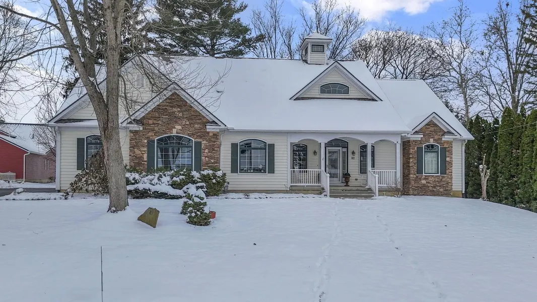 Stunning custom Cape Cod style home in a sought-after lake and golf course community, complete with a deeded boat dock! This one-of-a-kind home welcomes you with a charming covered front porch and stone & vinyl exterior. Offering generous space and thoughtful design. The gourmet kitchen showcases Amish-built cabinetry, Silestone countertops, a large island, and stainless steel appliances that remain. Brazilian cherry wood floors, solid interior doors, and railings add warmth and elegance throughout. Open-concept layout ideal for entertaining. Desirable primary suite with walk in shower, double vanity sink, and soaking tub. 2 half baths, and main level laundry. Upstairs you'll find two bedrooms, one full bath, and a versatile loft area. The fully finished lower level includes two bedrooms, egress windows, a full bath, a spacious family room, and a second laundry area. Perfect for guests or multi-generational living. Attached three-car attached garage, three season room, and extra shed ideal for a golf cart or mower. Brand new roof, three-zone Lennox heating and cooling, and whole house generator.