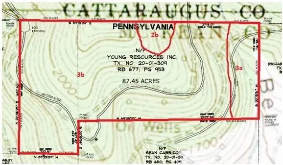 This 87.45-acre property is located approximately 1 mile north of Indian Crossing,Pennsylvania. It is adjacent to New York State and it shares its northern boundary with thesouthern boundary of New York State. It can be accessed via an old logging road thatbranches off of Barnum Road in Eldred, Pennsylvania, or it can also be accessed by loggingroads that enter the property from the north in New York State. These access roads travelthroughout the property but may need some upgrades as they are starting to carry water.The property is well-marked with red blazes and pink tape on the west, south,and north boundary lines. A survey was done in 2017 to mark the East line.Depending on which property map you look at, there is a federally recognized stream thatruns through this property along the eastern edge.Timber Condition: Clear-cut in 2008+-, this property is practically all sapling growth andhemlock. The only section that deviates is about 7 acres on the northern border comprised of 12? maples. Along the eastern boundary there is 15 acres that contain larger saplings and a handful of 12? ash and maple. The remaining 65 acres contain dense saplings.