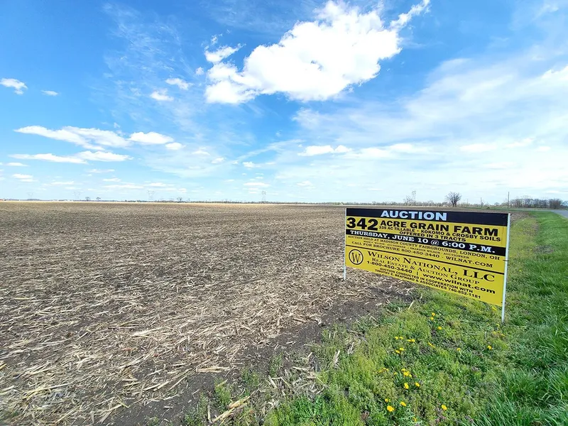 342 Acre Madison County Grain Farm, 334 acres tillable. Selling in 3 tracts. Tract #1 - 171.4 Acres vacant land with 170 acres tillable, Kokomo and Crosby soils. Tract #2 - 164.6 Acres vacant land with 164 acres tillable, Kokomo and Crosby soils. Tract #3 - 6.1 Acre lifestyle farm with 3 bedroom, 1 bath Cape Cod home. 1,560 sq. ft., living room, dining room, kitchen, partial basement, high efficiency forced air furnace, vinyl replacement thermal windows, new (2019) dimensional shingle roof. 4 Barns - 50x78 Morton 3 sided pole building with concrete floor (1986), 42x72 Morton pole building & 40x40 shop building (1981), 30x60 pole building (late 1960s). 5 Grain Bins - Approx. 22,300 bu. storage total with older dryer and wet bin, 1 unload auger and 2 roof top augers. This auction provides a rare opportunity to purchase a large parcel of high quality agricultural land in one field where land is seldom offered. This land has been in same family for over 100 years. A once in a lifetime opportunity to purchase at auction where the public will set the price.