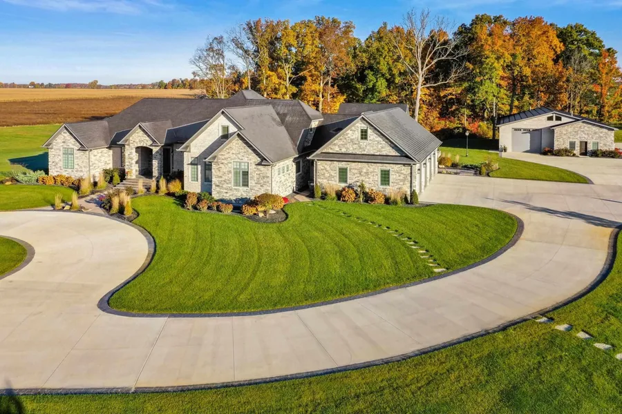 Welcome to one of the most exquisite and distinctive properties in Central Indiana! Situated on 32 acres, you are suddenly in another world after entering the private gates into this fully fenced paradise. You will find custom and rare materials and finishes throughout the 10,004 square foot, 6 bedroom/5 bath estate; from the lavish entryway with magnificent ceiling detail¦to the gorgeous marble and custom tile work. A luxurious chef's kitchen with Cambria Quartz Summerhill countertops is an entertainer's delight! The formal dining room & second large dining area in kitchen offer plenty of space for Holidays and parties. You will find three bedrooms on the main level; each with their own en suite bathroom and walk-in closets. The heavenly master retreat (on main level) has every desirable feature from "his & hers" walk-in closets, tray ceiling and a master bathroom that feels like an Italian getaway. Marvelous amounts of Carrera white marble cover the walls and floor. Other main floor features include dramatic 12 foot ceilings, two laundry rooms, a dramatic den/office, a formal living room and family room (open to the kitchen) with a striking, natural veneer stone fireplace. The lower level serves as a second incredible spot for entertaining with a state of the art fitness room which includes some of the most quality made gym equipment, high-end theater room, full kitchen w/ wine cooler, sophisticated pool table & system room which holds the high tech security system, dual sump pump (w/battery back-up and tankless water heater. A 4 car attached garage with wash station is an extra feature & additionally, there are three Geothermal systems for heating and cooling. Outside you'll experience more highlights with a fabulous pool house/guest house, covered kitchen area with sink, refrigerator, 5 burner SUMMIT Gas grill, two gas, luxury lava rock firepits (with seating), & heated, in-ground swimming pool. You'll also have plenty of storage for the toys with a beautiful 70x 55 all steel pole barn which is heated with concrete floors, electric service & a half bathroom. The appr. 2 acre fully stocked pond has a huge covered pavilion w/ large deck overlooking the pond which offers an amazing location for events or parties. Seller has included every attention to detail with Riprap rocks surrounding the pond & beach access. Additional outdoor features include expansive landscaping/hardscape work by Wassons Nursery. Sited in the highly desirable Yorktown Scho