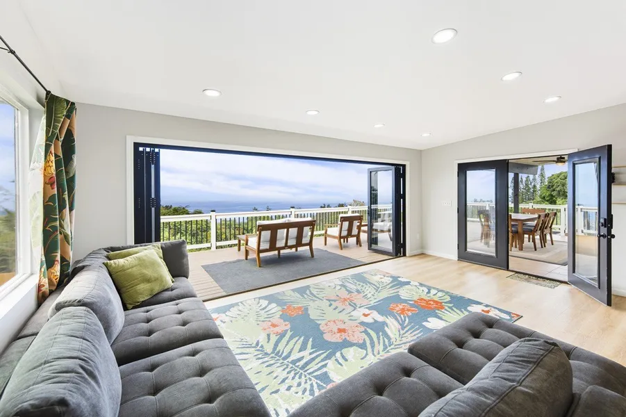 This beautifully renovated home offers stunning ocean views and features 2 bedrooms and 2.5 bathrooms. Each spacious bedroom includes a full bath and a walk-in closet. The entire home has been completely updated, featuring new laminate flooring throughout, as well as tile flooring in all bathrooms. Every room is equipped with a ceiling fan, and the main living area, including the dining room and kitchen, showcases recessed lighting. Experience a beautifully bright and highly functional kitchen, featuring quartz countertops and sleek stainless steel appliances. Enjoy cooking with a propane gas stove and oven, complemented by a convenient overhead microwave. This kitchen also includes a dishwasher and a spacious refrigerator/freezer combo. The laundry and utility rooms are conveniently located inside the home. The open-concept floor plan allows for a seamless transition between the outdoors and indoors, featuring bi-fold accordion doors with unobstructed ocean views. The open deck features a stylish railing for optimal views, Trex decking, and a great place to entertain. The covered deck features tile flooring and is equipped with two ceiling fans overhead. Situated on an acre of land with a mature banana patch and coffee orchard. Property has been cleared and improved, offering space for your own ideas. This property serves as a serene oasis of tranquility and unmatched privacy.