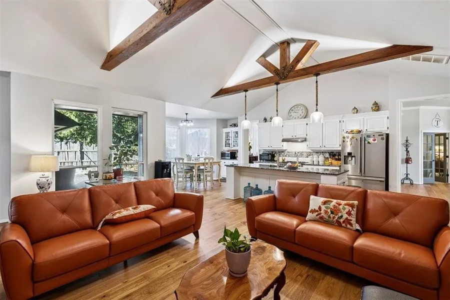 Up front, a secondary bedroom with its own bath makes an ideal guest space. The kitchen wows with vaulted ceilings and beams, a pantry, upgraded appliances with gas range, a large island, additional dining, and open flow into the living room with fireplace. Another bedroom and full bath are tucked nearby, plus a huge bonus/media room that easily serves as a fourth bedroom, game room, or playroom.