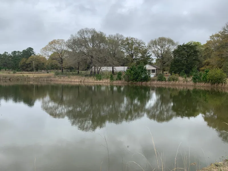 The 47 acres north of the creek include the house, a fish hatchery building, a barn, a concrete feed building, 2 well houses and 40 hatchery ponds. About 5 acres are in large oak and pine timber. The remainder is comprised of 20 acres of pasture and 20 acres of ponds. The entire perimeter is fenced with net wire fence and there is some cross fencing.