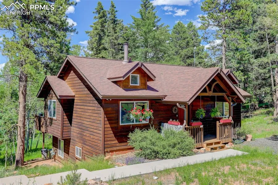 Welcome home to your very own Rocky Mountain Retreat! This stunning property exudes pride of ownership and boasts an immaculate, well-maintained interior. As you step inside, you'll immediately notice the open floor plan, soaring vaulted ceilings, and an abundance of windows that flood the home with natural light. The heart of the home is the gourmet kitchen, featuring stainless steel appliances, a gas range, granite countertops, a breakfast bar, and a separate dining area - perfect for cooking and entertaining. Recent updates include brand-new hardwood floors, fresh interior paint, modern kitchen appliances, and counters, as well as a new furnace, newer water heater, and a recently replaced roof. The main level bathroom has been completely remodeled with a stunning new shower, dual sinks, elegant countertops, new flooring, and updated light fixtures. Whether you're enjoying your morning coffee on the covered front porch or relaxing on the private rear deck, you'll be surrounded by the peaceful sounds of nature, with breathtaking views of pine and aspen trees and the wildlife that calls this place home. The professionally finished walkout basement offers a spacious living area with built-ins, a cozy fireplace, an oversized full bath, and ample storage space. As a resident, you'll have exclusive access to fishing at Lake Magnuson and the community ponds, a true luxury. Additionally, neighborhood trails connect directly to Mueller State Park, offering endless opportunities for hiking, mountain biking, and horseback riding. Conveniently located just 15 miles from Cripple Creek, 30 minutes from Manitou Springs, and 10 minutes to the Florissant Fossil Beds National Monument, this home is an ideal spot for both full-time living and a weekend mountain getaway. Whether you're seeking a primary residence or a serene escape, this beautifully appointed home is sure to capture your heart.