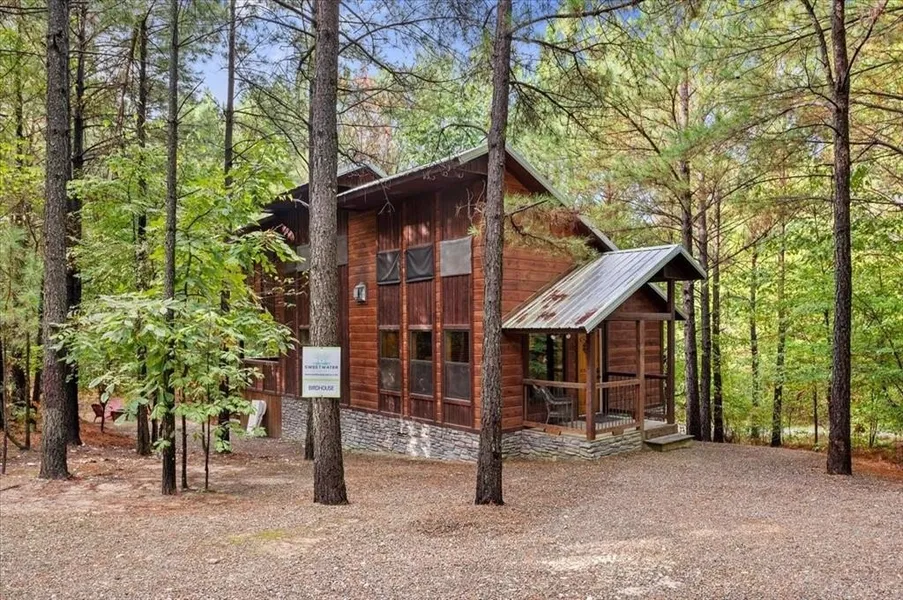 Tucked away within the serene beauty of mature mixed trees in Timber Creek Trails Ph VII, you'll find Birdhouse. This 1 bed 1 bath romantic retreat is the perfect blend of traditional cabin with a contemporary twist. This romantic retreat offers a great location near the golf course, lake access, dining and shopping. The vaulted ceilings and numerous windows flood the space with natural light, creating an inviting atmosphere. The kitchen, equipped with granite countertops, has all the essentials for preparing a meal for two. An island offers extra prep space and a place to dine. In the living room, guests can relax and enjoy a movie by the double-sided stone fireplace, which adds warmth, ambiance, and a gentle division between the living area and the spacious King bedroom. For added convenience, a full-size stacked washer and dryer are discreetly tucked away. The ensuite bathroom, accessible through double sliding barn doors, features a luxurious soaking tub and a walk-in shower with dual shower heads. From the bedroom, guests can step out onto the covered deck, where they can savor their morning coffee at a table for two. Unwinding in the hot tub will be a highlight of your stay. The fire pit is perfect for gathering around and sharing dreams under the starry sky. Birdhouse is also conveniently located near popular spots like Mountain Fork Brewery, Shuck Me, and Hochatown Whiskey Distillery, making it an ideal base for exploring the area.