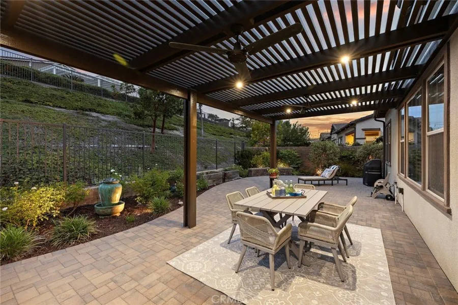 Welcome to this beautifully upgraded single-story home, in the coveted 55+ enclave of Avocet, ideally situated on an oversized, private lot. Offering two bedrooms, two full bathrooms and an office or flex room, this residence is designed for easy living and effortless entertaining. Inside, the open-concept floor plan features a striking built-in media wall with generous storage, plantation shutters, and a spacious dining area. The chef’s kitchen showcases upgraded stainless steel appliances, granite countertops, a convenient wine refrigerator, and a full wall of pantry cabinets with roll-out shelving. The serene primary suite offers a beautiful view of the expansive backyard and includes a spa-inspired ensuite bath with an oversized soaking tub, a frameless glass shower, and a walk-in closet with premium custom shelving. A comfortable guest bedroom and a spacious home office provide flexibility for hosting or working from home. Step outside to your private backyard retreat—complete with lush gardens, custom pavers, a trickling fountain, and a covered pergola with built-in lighting and ceiling fans. Enjoy evenings by the outdoor fireplace, unwind in the above-ground spa, or entertain in the expansive covered outdoor room—this space is designed for both relaxation and gatherings. As part of the award-winning Rancho Mission Viejo community, enjoy access to an array of resort-style amenities: including The Hacienda and The Getaway, offering amenities like a fitness center, saltwater pool, spa, bocce ball court, yoga studio, and cozy fire pits.