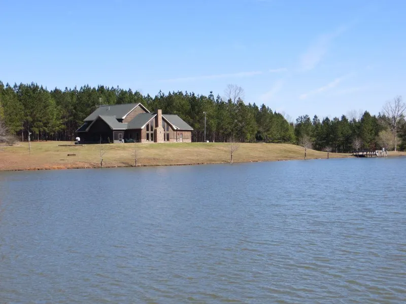 Has a 5bd 4ba lodge that comes furnished overlooking the 20-acre lake. The lodge is nice with a large den and kitchen area with a stone fireplace.
