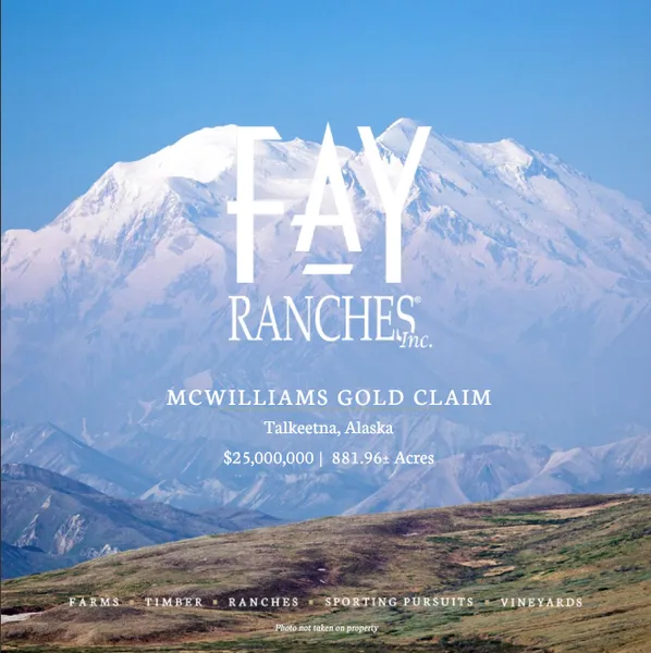Located within one hundred miles of Anchorage, Alaska, yet still in the remote Alaskan wilderness, you will find McWilliams Gold Claim. It is a historic gold mining area located in the heart of the Talkeetna Mountains. This offering, McWilliams Gold Creek, consists of 881.96 acres with patented mineral rights. The property lies on both sides of Chunilna Creek and Johns Creek, with approximately 7.5 miles of creek frontage.