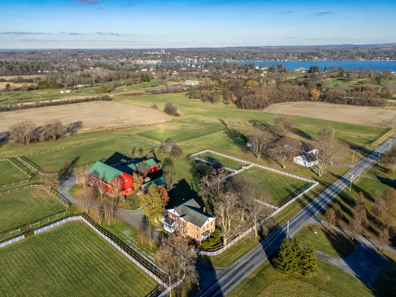 Welcome to this breathtaking 11.78 acres nestled alongside the renowned Skaneateles Polo Fields. This exceptional estate offers unparalleled privacy and charm, with the added luxury of being part of one of the area’s most prestigious equestrian locales. Enter the stately white-gated drive, where you’ll be greeted by a beautifully preserved 1869 brick residence. Spanning 3,696 square feet, the home showcases 6 spacious bedrooms, 3 full baths, and an array of exquisite woodwork and intricate architectural details throughout. Adjacent to the main residence is a charming guest house or in-law suite. The main level features a full kitchen and cozy living area complete with a stacked stone fireplace, while the upstairs offers a serene bedroom and en-suite bath. Outside, a private outdoor space with its own stacked stone fireplace provides an idyllic setting to enjoy stunning lake views—perfect for dining, entertaining, or simply unwinding in nature's beauty. The estate’s Celebration Barn is a true entertainer's haven. With expansive gathering spaces and four oversized sliding barn doors, it is perfectly suited for hosting events and large gatherings. The upper level, currently home to a billiards table, offers even more space for recreation and relaxation. The barn is seamlessly connected to a second guest house with a full kitchen, making it an ideal venue for both intimate family gatherings and grand-scale celebrations. For equestrian enthusiasts, the Horse Stable Barn is a standout feature, boasting 19 stalls equipped with electrical and water service. The nearby equipment barn provides ample storage or garage space, ensuring the estate remains both functional and well-maintained. Multiple fenced areas throughout the property make it an ideal environment for horses, creating a sanctuary for those with a passion for equestrian pursuits. Andrews offers a rare combination of beauty, functionality, and potential. Whether you seek a peaceful retreat or a luxurious venue for entertaining, this extraordinary Skaneateles property provides a one-of-a-kind lifestyle that is simply unparalleled.