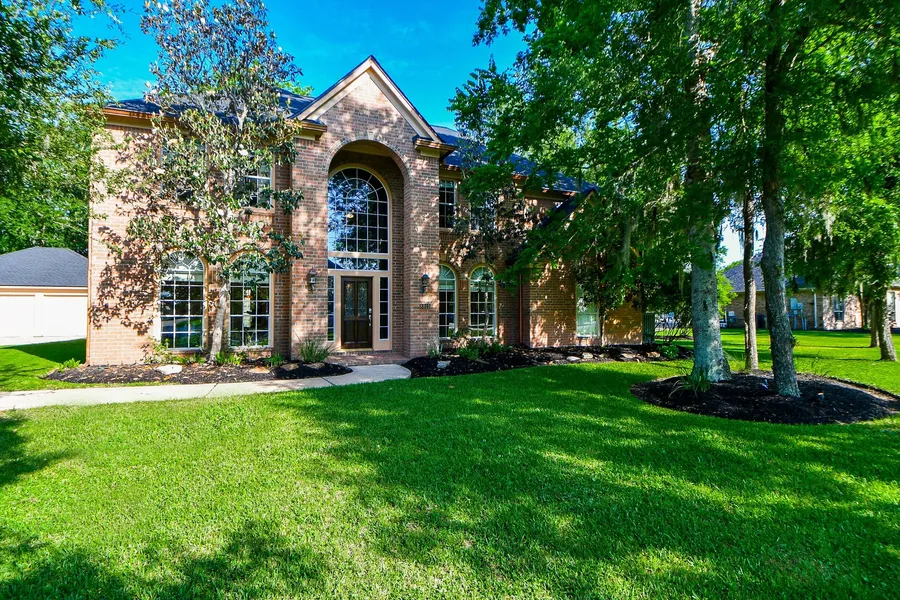 Situated in the tranquil Royal Lake Estates community, this 5-bed, 3.5-bath home sits on nearly 1 acre cul-de-sac of wooded land with a three car extended garage. Embrace privacy and wildlife with deer sightings, spacious front, side, and backyards, and a charming wrought-iron fence. A perfect setting to create your dream pool surrounded by trees. Inside, find a grand foyer, new flooring, gas fireplace, and a well-equipped kitchen with a large island and pantry. Enjoy ceiling fans, custom paint, a flex room/office, and a roomy game space. Tiled baths, a new roof in 2025, sprinkler system across entire yard, and lush landscaping make this property complete. Added addition of an in-ground trampoline, new roof and no history of flooding. Peaceful surroundings with spaced neighbors. Book a tour now!