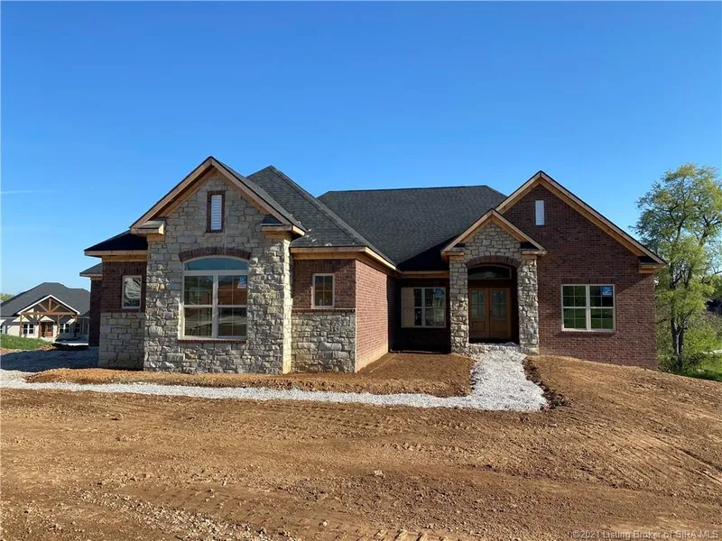 WHY CUSTOM BUILD when DISCOVERY BUILDERS has already Designed this AMBROSE III PLAN with CUSTOM HOME Features, including, 11' Ceilings in Foyer, Great Room, Kitchen & Dinette, all with Crown Molding. Engineered Hardwood Flooring on the Main Level & Fireplace with Bookcases in the Great Room. This Handsome Brick & Stone Ranch Style Home includes a 3-Car Tandem Garage, Large 12' x 18' Covered Deck with additional Open Decking & Extensive Lower Level Patio Space accessible from the Walkout Lower Level. This home includes approximately 3,500 SF of Professionally Designed & Decorated Space with DISCOVERY BUILDER QUALITY throughout. This Split Bedroom Ranch Plans sits in the cul-de-sac with a 1.35 Acre Lake View Site in Award Winning Floyd Central High School District. ALL Rooms are Spacious & Well Appointed. The Owner's Suite includes a Hip Vaulted Trey Ceiling with Crown Molding. The Owner's Luxury Bath includes a Large Walk-in Corner Tile Shower with (2) individual vanities & (2) Linen Closets. The Owner's Walk-in Closet is connected to the Laundry Room for Easy Access. This Plan also includes a POWDER BATH for Guests, a WALK-IN PANTRY & Owner's Entry with Bench and Cubbies. The Lower Level is Finished with 9' Foundation Walls & Lots of Natural Light. There's a 4th BR with Walk-in Closet, a 3rd Full Bath, Family Room/Media & Game Table area & a WET BAR with STANDING/SERVING COUNTER. This home also includes Upgraded Stainless Kitchen Appliances. Sq ft & rm sz approx.