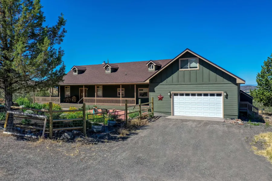 Enter the gated driveway and wind your way up the rolling hills for stunning vistas and a 2468 sf, 4-bedroom, 2.5-bathroom custom home situated on more than 325 acres. Numerous renovations have enhanced the efficiency, style, and functionality of this entire property. Floor to ceiling windows embrace the landscape and flood this home with natural light. Two tax lots, each over 162 acres (325.37 total acres), offer the option to retain the property for increased privacy and recreational options, or to sell the second view tax lot for an extra building opportunity. The property is enclosed by perimeter fencing and cattle guards. Relax on the wrap around porch enjoying stunning views of the Cascade Mountains, rolling hills, and lush irrigated land. Enjoy warm radiant heated floors in the spa-like primary bathroom with an ample walk-in closet in addition to a generous bonus room/4th bedroom upstairs offering a magnificent panorama off of the upstairs deck. This home has a streamline spacious floor plan with wood and stone surfaces in the kitchen, as well as natural & live edge trim with vaulted ceilings. In recent years the home has had a new roof, heat pump (2018), water heater (2019), newer wood stove and a Nationwide solar panel system with battery bank (6 years left on transferable warranty). This property allows for modern amenities while still maintaining privacy and a short 10 minute drive to town. Don't miss out on the chance to see this incredible home with breathtaking views, plenty of land for ATV, hiking, horseback riding, get LOP tags or apply for private unit. A spacious multi-purpose shop with 3 large bays, a heated workshop, bathroom and RV hookups give ample covered space. Additionally multiple greenhouses, sheds, corrals, orchard and fenced garden give room for adventure and hobbies.