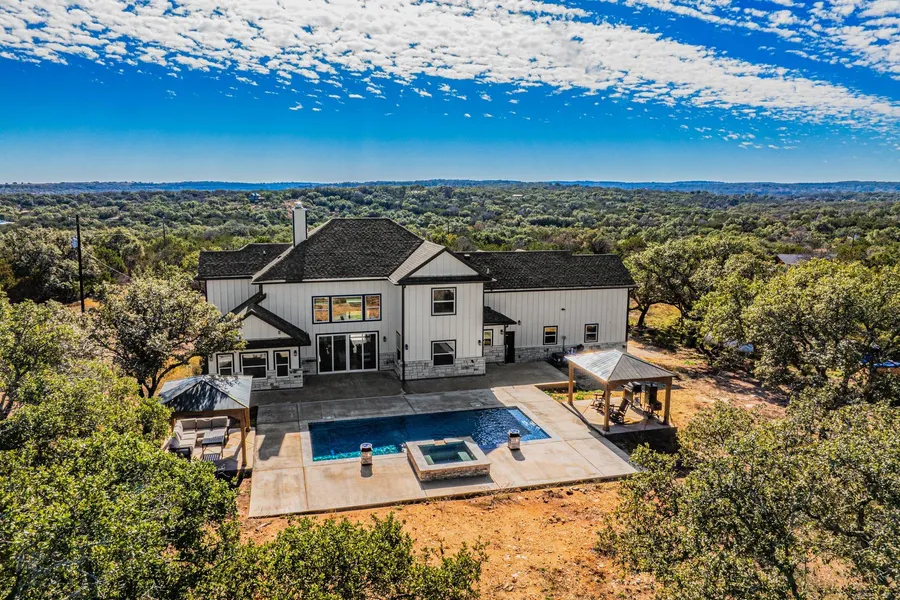 Indulge in a true Texan lifestyle within the privacy of this home nestled on a serene country road, safeguarded by a gated entrance and surrounded by beautiful Oaks. This expansive 10-acre property offers the potential for a ranch lifestyle with space for various livestock. Built in 2023, the home is 4 bedroom, 3.5 baths and spans 4,376 sqft. Stepping inside the home, you are greeted by a grand 20' tall foyer and living room, featuring a warm stone fireplace that extends to the ceiling, with the option of propane or wood. Custom features throughout the home include quartzite countertops, marble backsplash, tile floors, custom cabinetry, marble showers, champagne bronze fixtures, and 2.5" Bali wood blinds. The luxurious kitchen includes Thermador appliances with wifi capabilities, and other added features. A large walk-in butlers pantry, including an additional refrigerator. Under the stairs is a spacious storage room which could be made into a wine cellar or second pantry. A massive upstairs bonus room provides a wet bar, and with the ample space, can be utilized as an in-home movie theater, gym, game room, or more. Outside custom features include a 15'x35' pool with a sundeck, a cascading 7'x7' spa, plus two 15'x12' gazebos. The home is set up for ultimate entertainment! Feel at peace away from home with a backup generator with auto start and wifi capabilities. There is also a 1,000 gallon propane tank with enough fuel to run the generator for a month; and a 2,000-gallon water holding tank. Last, with no HOA, a modest annual POA fee of $200 grants exclusive private access to a renowned Pedernales River Park! The home is situated just 8 minutes from downtown Johnson city, 20 minutes from Dripping Springs and 1 hour from Austin and San Antonio! Schedule a showing today!