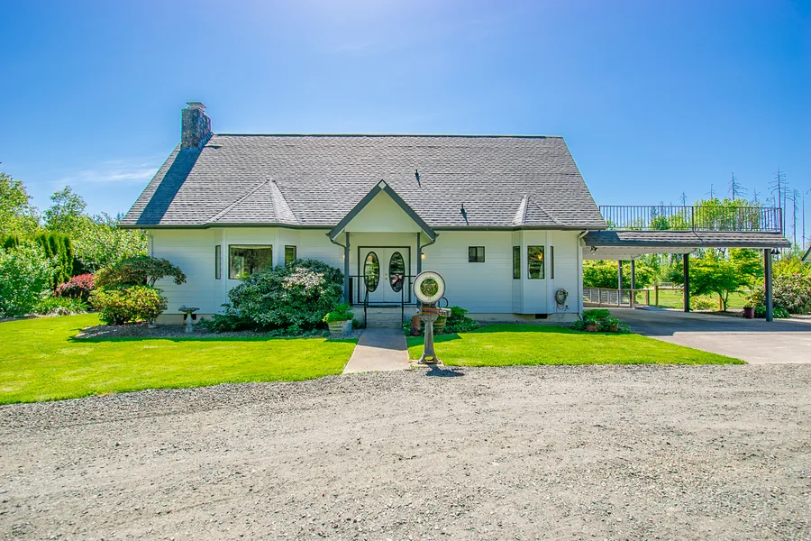 Gorgeous custom built home in park like setting! House features impressive great room with 24' Hemlock tongue & groove open beam ceiling, custom shale rock fireplace, and statement staircase. Spacious master on second level with large private patio. Detached garage features two additional fully finished bonus rooms with ductless heatpumps and sliding doors. Property is 6 acres, and includes large shop, creek, orchard, animal pen, fully landscaped back yard, and two wells. Perfect hobby farm!
