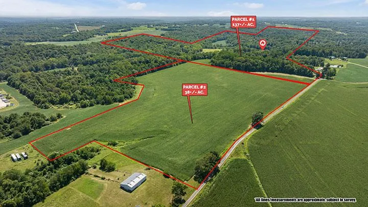 Parcel #2: 38 +/- acres gently rolling, tillable farmland. Approx. 1,600+ ft. frontage.