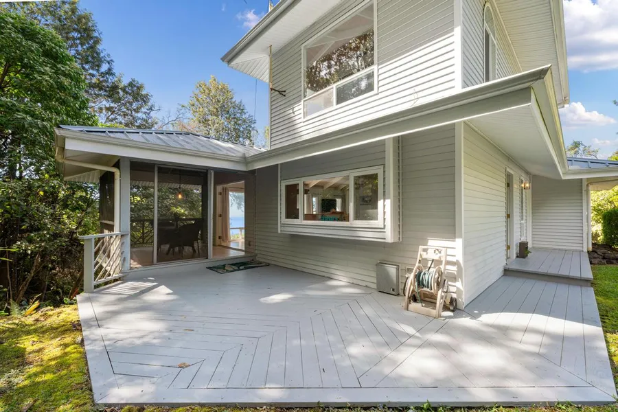 HAWAIIAN COUNTRY CHARMER ON 1.8 LUSH ACRES WITH AN OCEAN VIEW. Private driveway to the custom home features high open beams throughout. The light and bright open concept living area is complete with a spacious kitchen, butcher block island and breakfast bar. Large view windows in the great room and a fireplace. The living area with french doors that opens onto the screened-in lanai for your alfresco dining and entertaining. Plus an open porch overlooking the gardens. The large ensuite is complete with a walk-in closet and a private balcony with ocean and garden views. Ensuite bath includes a tiled walk-in shower with accent tiles & block glass. Nicely remodeled power room on the main floor. The upstairs guest room is private with ocean views. A very spacious laundry room is located downstairs, which also houses the water pump & filter as well as a large storage area. Expandable for a possible additional bedroom, bath and sitting area downstairs with an existing staircase leading to the main floor. Bathroom plumbing is already stubbed out & building plans are included in the sale, which would add approximately 600 sq. ft. of living space to the home. There is also a one-car carport, which could be enclosed as a garage. The home is surrounded by mature landscaping and an ohia forested area beyond. 15,000 gal.water catchment tankand garden shedis tucked away in the trees. This is a one of a kind property, your own private sanctuary. Other features include: New ceiling fans New disigner light fixtures New waterfall faucets in the bathrooms Large pavers/tiled flooring Fresh interior designer paint French door entries No stairs to the main level Underground utilities Green lawns & tropical landscaping