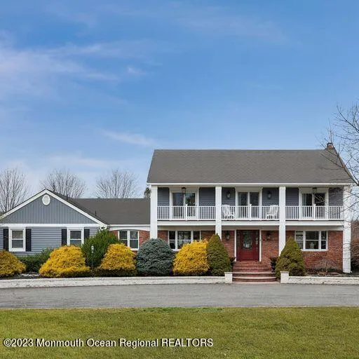 This Colts Neck classic center hall colonial sits on 3 acres of sprawling, tree lined, private property on quiet cul de sac. 5 BR home offers open floor plan & spacious kitchen. First floor bedroom/ full bathroom offers separate entrance & living space ideal for mother/daughter living, guests or live in help. Great room w/ cathedral ceilings & sliders flows to grand deck that runs off entire back of home overlooking rolling acres of property. Walk out basement is light filled w/ floor to ceiling windows & sliders to beautiful backyard. Second story mahogany balcony, w/ bedroom access, running off the front of house gives home distinctive exterior classic charm. Newer AC units, newer generator, newer exterior vinyl siding & moldings, LED recessed lighting & newly painted interior.