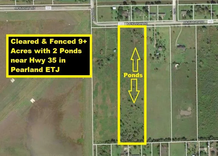 New Price! Cleared & fenced 9+ acres w/nice trees & 2 ponds near Hwy 35 in Pearland ETJ. Surrounded by country homes & acreage. Quiet area & great location to build a home. Close to Pearland Recreation Center & Natatorium. Minutes to 2 Hermann Memorial Hospitals, San Jacinto & Alvin Community Colleges, Hobby Airport, Pearland Town Center & Baybrook Mall. Many routes available to Downtown Houston, Texas Medical Center & Galveston Beach via I-45, Hwy 6, Beltway 8, Hwy 288 & Pearland Parkway. Ag Exempt Potential! Very low taxes & no HOA Fees! Horses on Property! Gate is locked! Call Heidi for more information or to walk property!