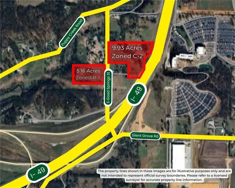 Outstanding opportunity to acquire 10± acres of commercial land directly visible from I-49, with over 100,000 vehicles per day. Razorback Greenway frontage at mile marker 22. Zoned C-2 and all utilities on site. Positioned in a high-growth area, this property offers convenient highway access and exceptional regional connectivity. Seller to retain rights and access to existing billboards.