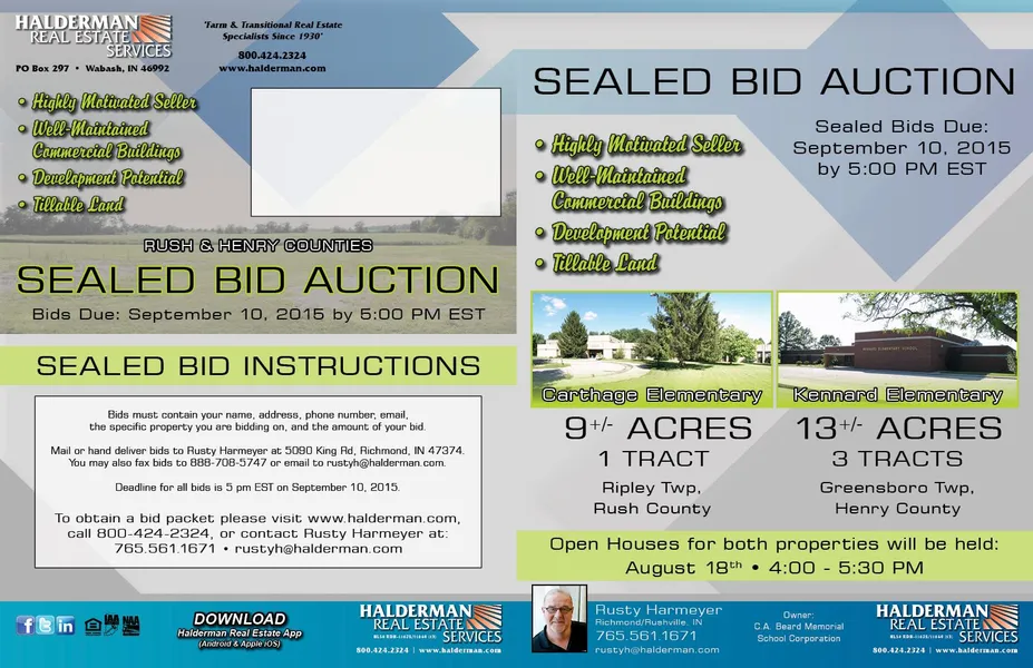Auction Location: Sealed bids must be submitted by 5 pm EST on September 10, 2015, to: Rusty Harmeyer at 5090 King Rd, Richmond, IN 47374. Bids may also be faxed to 888-708-5747