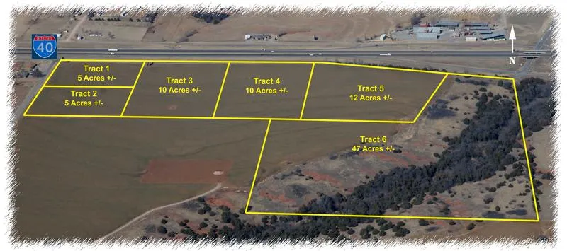 Tracts 1-5 all have easy access from I-40 at Exit 88 near Hydro, Ok. These parcels also have frontage to the south service road and have great visibility from Interstate 40. This parcel will be offered in tracts ranging from 5 to 12 acres and then offered in a larger 42 acre parcel. This land is currently in agricultural production. Tracts 1 and 3 have income production form billboard leases.