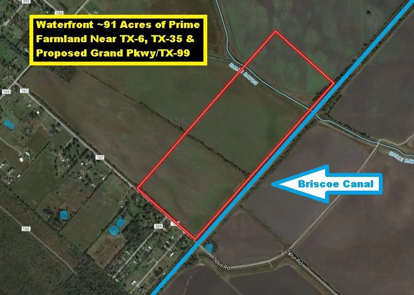 New Price! Waterfront ~91 Acres of Prime Farmland Near TX-6, TX-35 & Proposed Grand Pkwy. Hunt & Fish Along Brisco Bayou which runs through back section of property. ~1189 ft CR 167 Road Frontage & ~3300 ft Briscoe Canal Frontage. Hunting Allowed! Needs Well & Septic! Outside City Limits! Verify Restrictions! Low Taxes! Proposed Grand Pkwy/TX-99 (Houston's 3rd Loop) will span 180+ miles from League City-Alvin-Rosharon-Sugar Land-Katy-Tomball-Spring-New Caney-Dayton-Mont Belvieu when complete (see map). Minutes to I-45 and Alvin Schools & Community College. 20 miles to TX-288, BW-8, Johnson Space Center & Kemah Boardwalk. 25 miles to Hobby Airport & Angleton. 38 miles to Downtown Houston & TX Medical Center. 42 miles to Galveston Beaches & Freeport. Great Location! Perfect for Farm & Ranch or Residential Development. Contact Capital Farm Credit for Loan!
