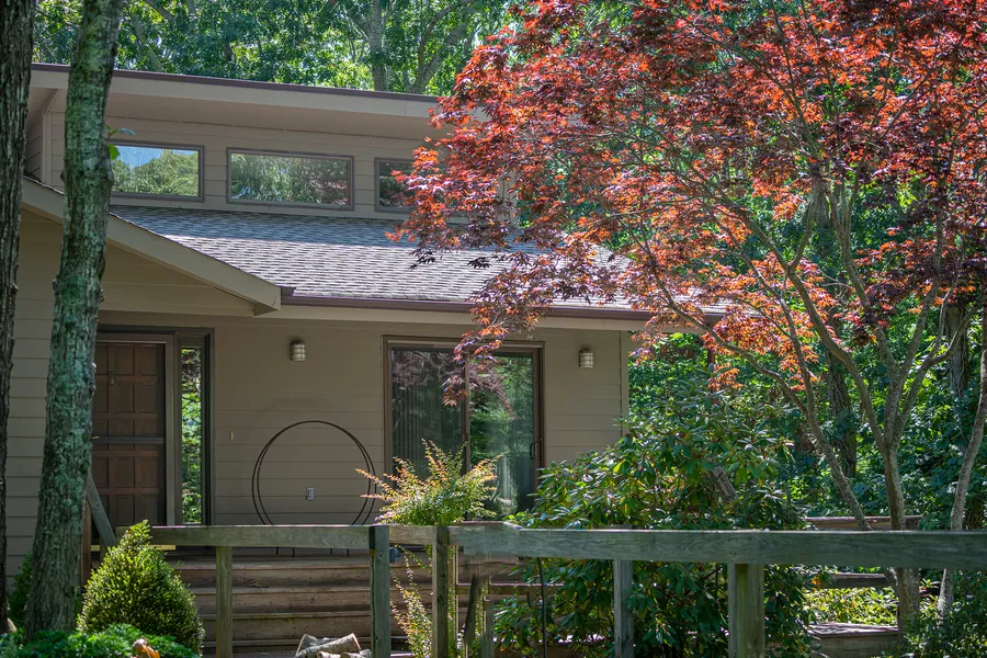 Nassau Point gated home with modern lines that feature high ceilings, and style elements. Sleek double sided brick fireplace, deck off the kitchen, dining room with deck and master bedroom with high slope ceiling and deck. Short jaunt to Fishermans beach down Haywaters Road or moments to Nassau Point park and beach.