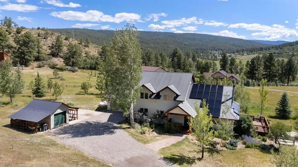 Friendly, walkable location in beautiful Pine River Ranches has something for everyone! Large home on grassy lot with mature landscaping, great barn, storage shed, pet fencing, lofty views, dependable well, has so many uses and amenities. Adjacent lots may possibly be purchased. Spacious Gunnar Andersen designed home has combined comfortable, welcoming spaces and light with practical amenities like rooftop solar array, high efficiency heat pump for heat and AC, infra red heating bars, 2 wood stoves, favorable solar orientation, short term rentals allowed. Energy Star appliances, EV plug-in, RV parking area. Two huge family rooms provide so many choices for use, storage, and enjoyment. Downstairs family room could be re-converted to 2 car garage if desired. Excellent floor plan takes advantage of open pattern, looking out to neighboring pastures, yard, mountain ridges, and river valley. Cross fenced yards, patios and decks provide spaces for entertaining, pets, and gardening projects. Subdivision is well tucked off county road yet extremely accessible to the town and schools of Bayfield and the activities of the lakes and National Forest. Economical HOA. Catch and release Pine River and pond fishing access is afforded to all owners in this peaceful rural neighborhood. Low traffic volume and quiet setting and open space meld the advantages of rural living with modern conveniences. Three bedrooms on main floor are complimented by two huge activity rooms---one upstairs and one down. Upstairs room is open and large and downstairs space has adjoining indoor workshop. Kitchen has pantry and plenty of workspace and additional storage. Energy Star appliances, Bosch dishwasher, glass top stove. Dining and living areas are light-filled with passive solar designed for seasonal advantage and beckoning window seat. This well-planned home is ready for your comfort and enjoyment.