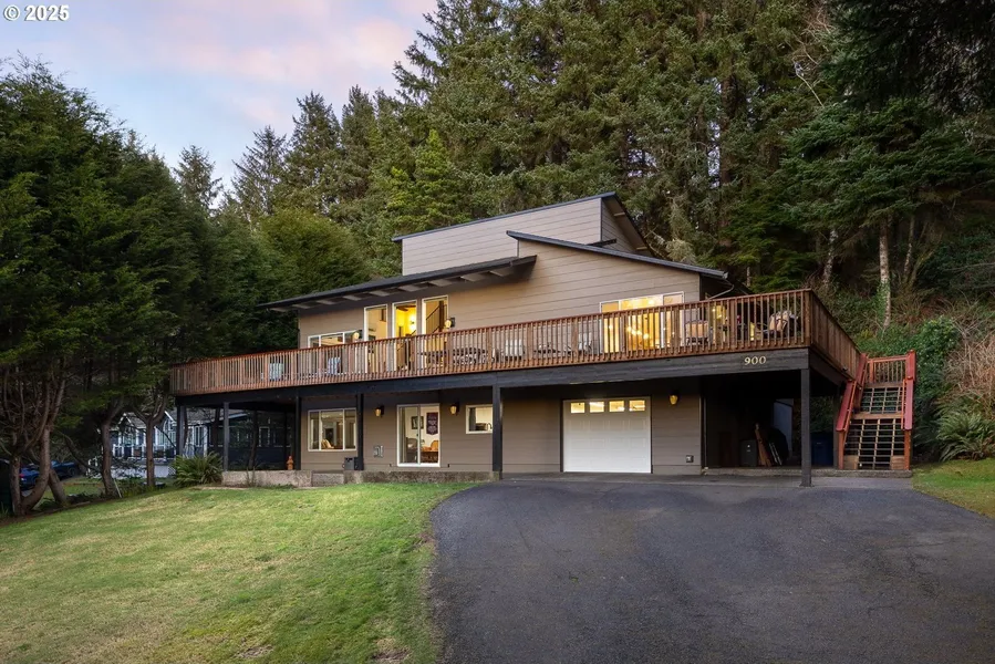 This exquisitely remodeled residence combines modern luxury with breathtaking ocean views, offering a rare dual living opportunity. The lower level features a spacious one-bedroom apartment with a gourmet kitchen, quartz countertops, stainless steel appliances, and gas cooking. The open-concept living area is enhanced by updated flooring, 1.5 bathrooms, a dedicated laundry room, and ample storage, providing both style and practicality. Upstairs, vaulted ceilings and oversized windows create a bright, airy atmosphere, while the wraparound deck showcases panoramic ocean vistas, perfect for entertaining or relaxing. The chef's kitchen includes high-end appliances, a large pantry, and custom quartz countertops, seamlessly flowing into the living and dining spaces. A cozy den, a convenient half bath, and a luxurious primary suite complete the main level. The upper floor offers two spacious bedrooms and a beautifully appointed bathroom. Additional highlights include a one-car garage, a dedicated workout room, and a dry saunaproviding ultimate comfort and convenience. With its stunning views, sophisticated design, and ideal layout, this home offers the best of coastal living.
