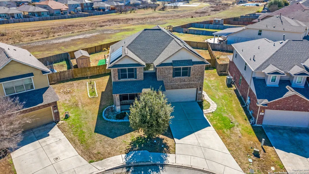 Beautiful 2-story home boasts 5 bedrooms, 3.5 baths and a wealth of luxury features is nestled in a quiet cul-de-sac on a .33-acre lot, with a heated pool, jacuzzi, solar panels, and backing onto a serene greenbelt. The home has been thoughtfully designed to offer spacious living and modern functionality. Home features a large entry area with high ceilings, living room dining room combo a large kitchen with tons of cabinets, granite countertops, a high-end reverse osmosis system, spacious breakfast area and a breakfast bar that seamlessly flows into the family room where you'll find soaring ceilings and large windows flood the space with plenty of natural light. The main floor also includes the oversized Owner's Retreat and is a true sanctuary, offering ample space for a king-sized bed and more, along with its on suite bathroom and a massive walk-in closet, a laundry room, and power room. Upstairs, you'll find four spacious bedrooms, two full bathrooms, a large game room or office space, and a versatile media room. Step outside to your own private outdoor oasis. The backyard features a covered patio, a large deck, and a luxurious in-ground heated pool and jacuzzi. There's also plenty of yard space with a practical shed, offering endless possibilities -whether you want to add a playscape, a pickleball court, or any other outdoor features. Conveniently located with easy access to I-10, Loop 1604, Randolph AFB, and I-35, this home offers seamless connections to all that San Antonio has to offer. Experience luxury living at its finest in this exceptional residence, where every detail is designed for comfort, elegance, and functionality. Schedule your private tour today and make this dream home yours! Must SEE!!!