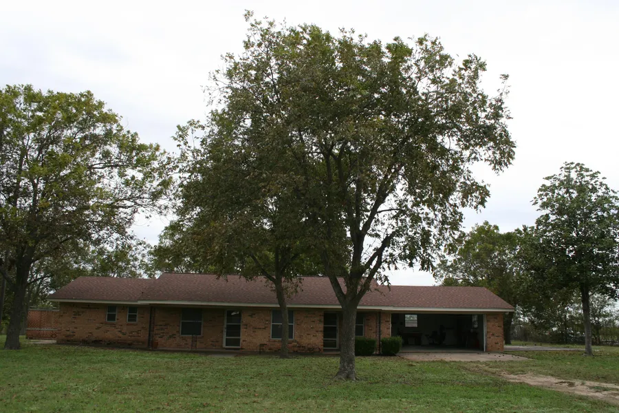 Brick 2/2.5 on 1.020 acres,large back yard that backs up to fields, 15 pecan trees,family room dining and den combo, large master, guest, plus office with built in book shelves, large patio across back of home, over sized garage with 2 work benches, 2 storage buildings in back yard,
