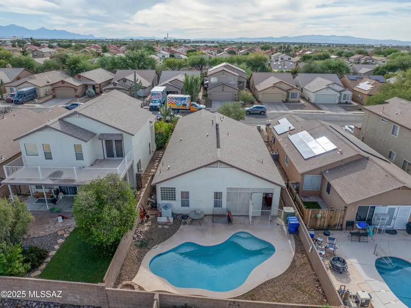 Everything you're looking for in Tucson living! This charming 3-bedroom, 2-bath home checks all the boxes, including a refreshing swimming pool! Enjoy tile flooring throughout the main living areas and a bright kitchen featuring light wood cabinetry, stainless steel appliances, and a convenient pass-through window to the dining space. The primary suite offers a remodeled tub/shower area with travertine tile surround and a nice soaking tub plus a spacious walk-in closet. Important updates have already been taken care of - roof replaced in 2014, poly pipes replaced with PEX, plus a newer AC unit and garage door with newer opener. An enclosed patio adds flexible space for relaxing or pets, and both front and backyards are designed for easy maintenance. Best of all, you'll love cooling off in your own private pool the perfect retreat for Arizona summers!