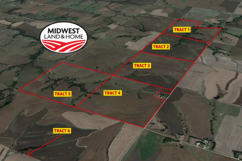 Tract Locations: From the US Highway 36 and Kansas Highway 148 intersection (Hanover Corner at Pony Express Truck Stop) travel east on US Highway 36 approximately 2 miles to Cross Creek Road. Tract 6 is located on the south side of US Highway 36 and the west side of Cross Creek Road. Continue east on US Highway 36 for 1 more mile to 1st Road/County Line Road. Turn north on 1st Road/County Line Road and travel north for 1 mile to 20th Road. Tract 4 is located on the northwest of this intersection.(Excluding approximately 6 acres parcel with home) Tract 5 is located 1/2 mile west of this intersection on the north side of 20th Road to Cross Creek Road. Tract 3 is located 1/2 mile north of the 1st Road/County Line Road and 20th Road intersection to 21st Road. Tract 2 is located on the west side of 1st Road/County Line Road and the north side of 21st Road for 1/2 mile. Tract 1 starts 1/2 mile north of the 1st Road/County Line Road and 21st Road intersection on the west side of the road. Tract 1 is located directly north of Tract 2 on the west side of 1st Road/County Line Road and the south side of 22nd Road. (Except for approximately 20 acres located to the south and west of the 1st Road/County Line Road and 22nd Road intersection.