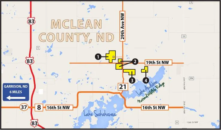 Driving Directions: From the Garrison, ND turn at US 83 & Highway8/16th St NW go east 6.7 miles to 21/29th Ave NW, then go 1.5 miles north. This will bring you the northwest corner of Parcel 3 and the southeast corner of the Parcel 2. Go north another mile and go west 1 mile on 19th St NW. This will bring you to the southwest corner of Parcel 1. Go east 3 miles and go south mile on field road(25th Ave NW). This will bring you to the northeast corner of Parcel 4.