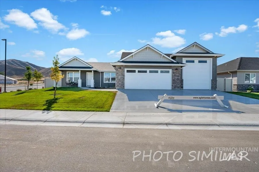 The Shoshone by Agile Homes is a single-level home with a spacious split bedroom design and features 4 bedrooms and 2 baths w/ an insulated 3 car garage and RV Bay. This home is a top favorite. Situated on a corner .20 acre lot. The vaulted ceilings and large windows in the main living area, allow for an abundance of natural light to flow throughout. The kitchen features our biggest island, custom cabinetry, quartz countertops, stainless steel appliances, and has a generous sized butlers pantry. Escape to the spacious 14x17 primary suite that features dual vanities with quartz countertops and walk in shower. This new home highlighted with low cost Natural gas, full gutters, front sod, full auto sprinklers, pressurized irrigation, and full fencing. Enjoy evenings on the covered back patio. RV parking as well w/ concrete ribbon approach, rv gate & compacted road mix behind gate. Overall, the Shoshone is a well-executed floorplan with a great entertaining area. Photos are similar/not the actual home.