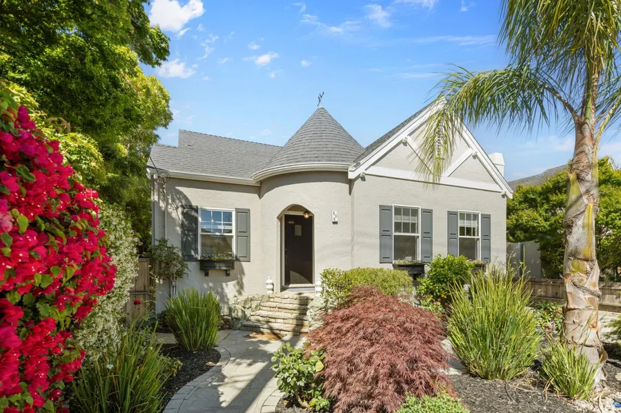 Old world charm & character define this Carmel style residence in sought after Sunnybrae! Covered stone front entry enhanced by an architectural featured rotunda. Formal entry w arched doorway leads to the inviting living room w an abundance of natural light. Dramatic vaulted beam ceiling, marble encased gas fireplace & decorative mantel vintage accent light sconces all add to the ambience. Cozy dining room adjacent to updated spacious kitchen with natural Silestone Quartz counters, timeless white cabinets, tiled floor & SS Frigidaire appliances, including a 5 burner gas cook top, vent hood & mosaic tile backsplash. Hallway leads to dual access full bath with tiled flooring, stall shower & separate soaking tub. Gleaming hardwood floors. Convenient laundry room w ample storage cabinets. Front bedroom has a walk-in closet. Private deck, landscaped yard & extensive patio ideal for year round outdoor living. Side gate for added privacy. Rare detached garage - seller has plans for converting to ADU. This home is a gem!