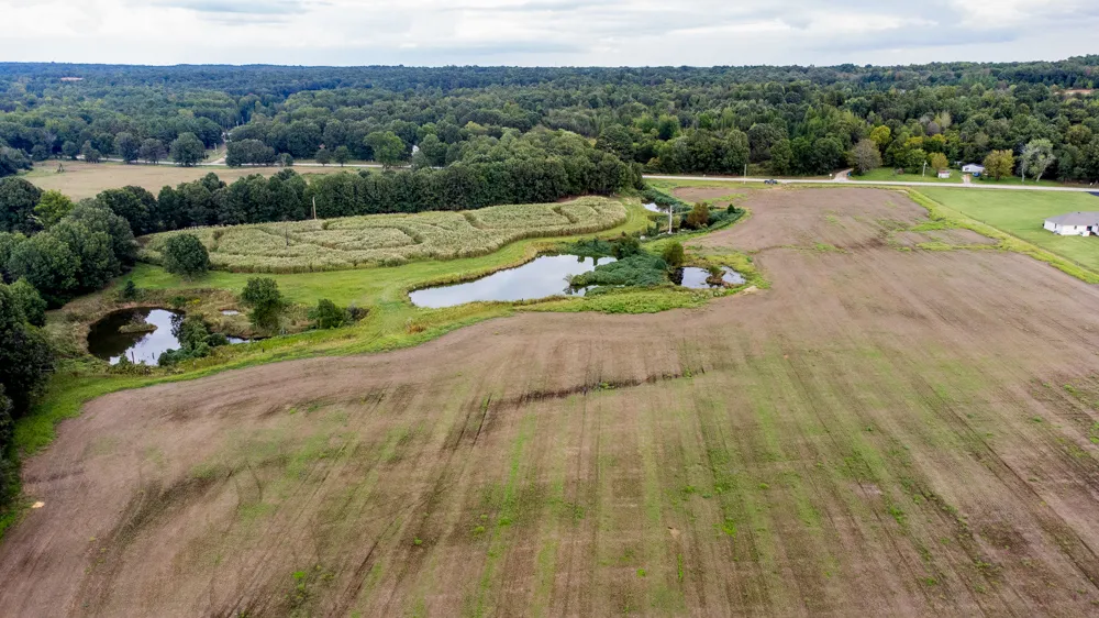 Currently, the property is utilized for agriculture, with a corn and soybean rotation on the crop ground, making it a productive investment for farming. A 48'x46' horse barn adds value for equestrian enthusiasts or those looking to expand into other types of livestock. The diverse layout of timber, open fields, and water features makes this land versatile for various uses, whether it be agricultural, recreational, or residential development.
